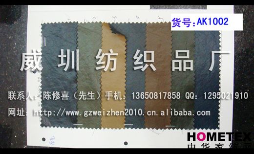 幅寬:140 別名:AK1002 厚度:0.8 主要用途:鞋、箱包、服裝、手套、家居、家具 品種:PU革 貨號(hào):AK1002 ============================================================= 以上產(chǎn)品全部現(xiàn)貨供應(yīng),可隨時(shí)提供樣布卡和現(xiàn)貨,隨時(shí)發(fā)貨。所有產(chǎn)品全部是廠家直銷價(jià),我們承諾:以超低利潤(rùn)營(yíng)銷,我們只求銷售量。為保證您的利益,我司建議您在采購(gòu)前先確認(rèn)我們的品質(zhì)樣與顏色樣后再拿大貨,期待與您的真誠(chéng)合作。因產(chǎn)品種類較多,具體參考未盡詳盡,如有需要,請(qǐng)您與我們聯(lián)系。 瑞豐紡織(中大旗艦店)坐落于國(guó)內(nèi)最大的紡織面料產(chǎn)業(yè)中心—廣州中大,是一家專業(yè)銷售面料的廠家直銷商。主要經(jīng)營(yíng)產(chǎn)品有:全棉凈色、仿記憶絲面料、全棉(TC)色織等,面料品種花達(dá)上千余種,所有產(chǎn)品全部現(xiàn)貨經(jīng)營(yíng)。 我們面料的品質(zhì)來源于:1、采用國(guó)內(nèi)外優(yōu)質(zhì)的原材料;2、使用精良的生產(chǎn)工藝和設(shè)備;3、完善的生產(chǎn)質(zhì)量管理體系。我們具有開發(fā)和創(chuàng)新品種的強(qiáng)烈意識(shí)和優(yōu)越條件,并根據(jù)客戶需求與市場(chǎng)變化時(shí)時(shí)推出潮流面料。憑著多年的專業(yè)行業(yè)經(jīng)驗(yàn),根據(jù)客戶需求,不論客戶在全國(guó)任何地方,只要提供小樣,就可在一兩天時(shí)間內(nèi)輕松獲得所需面料的信息。 批發(fā)說明供應(yīng)商支持混批 。 ============================================================= 有意請(qǐng)加QQ:1295021910或電話聯(lián)系。 公司名稱:威圳紡織品廠 聯(lián)系人:陳修喜先生 手機(jī):13650817858 網(wǎng)址:http://www.gzweizhen2010.cn.alibaba.com =============================================================