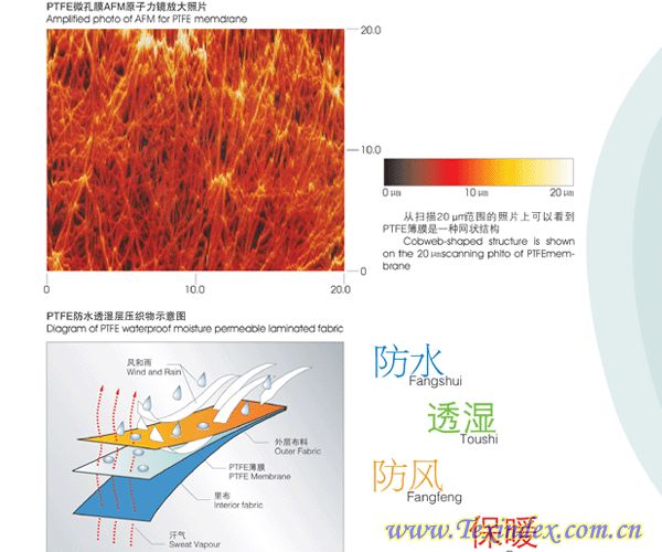 特點:防水、防毒、防腐、透氣、透濕、保暖、耐寒、耐老化、耐水洗、回彈性好、不起泡、環(huán)保,被稱為會呼吸的面料。
